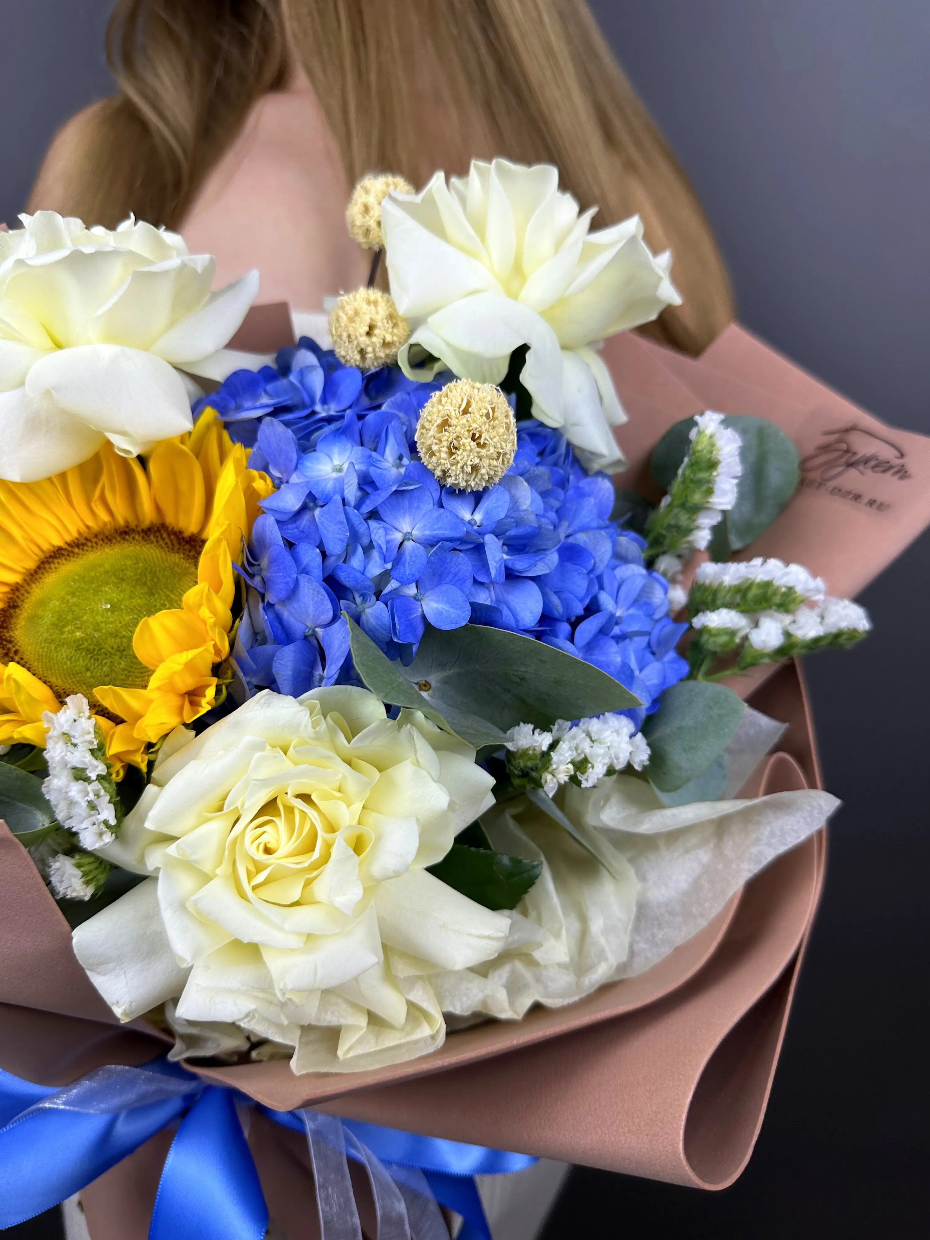 Букет с синей гортензией и подсолнухом - пример оформления на фото. Состоит из: Подсолнух - 1 шт,