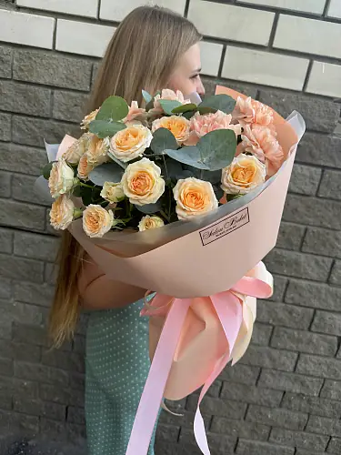 Гвоздика и кустовая Роза - пример оформления на фото. Состоит из: Роза Кустовая - 3 шт,