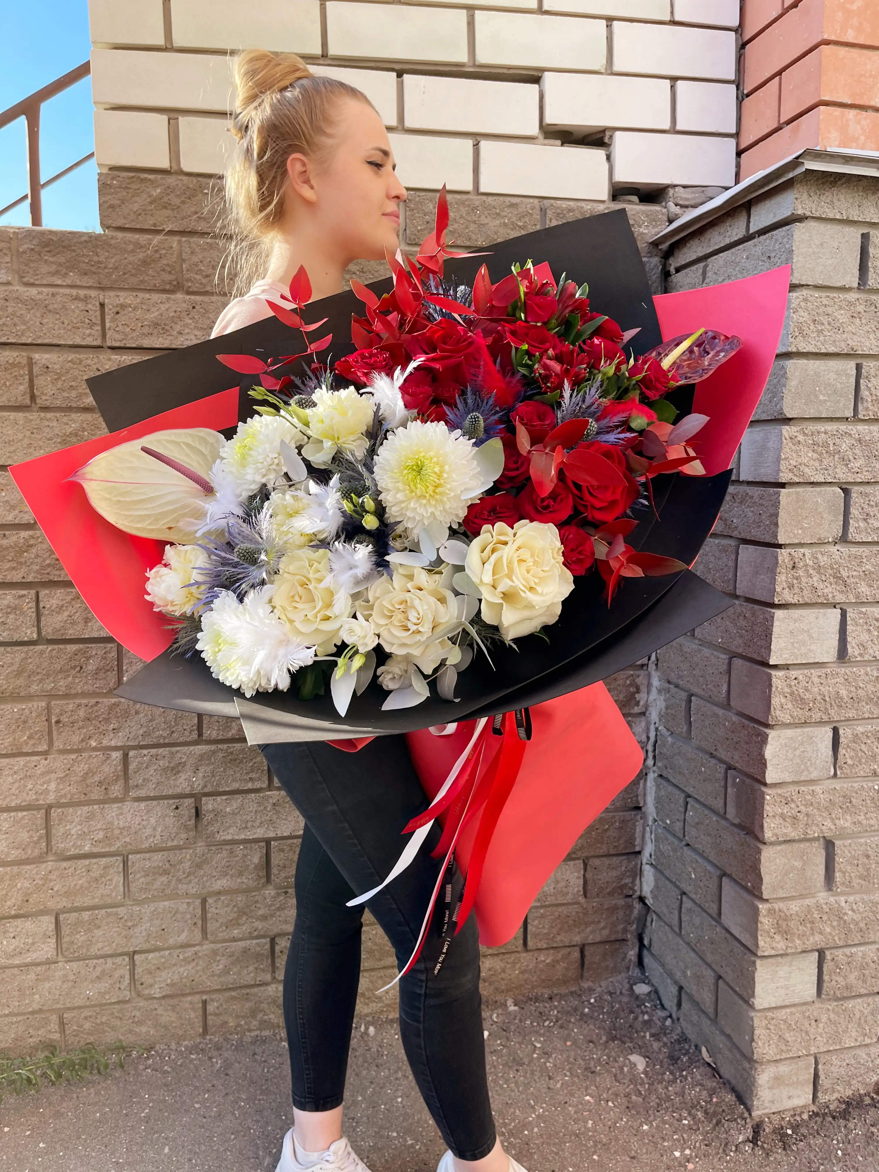 Букет составляется непосредственно в день доставки из свежих цветов, а затем с приятной улыбкой вручается адресату.