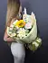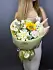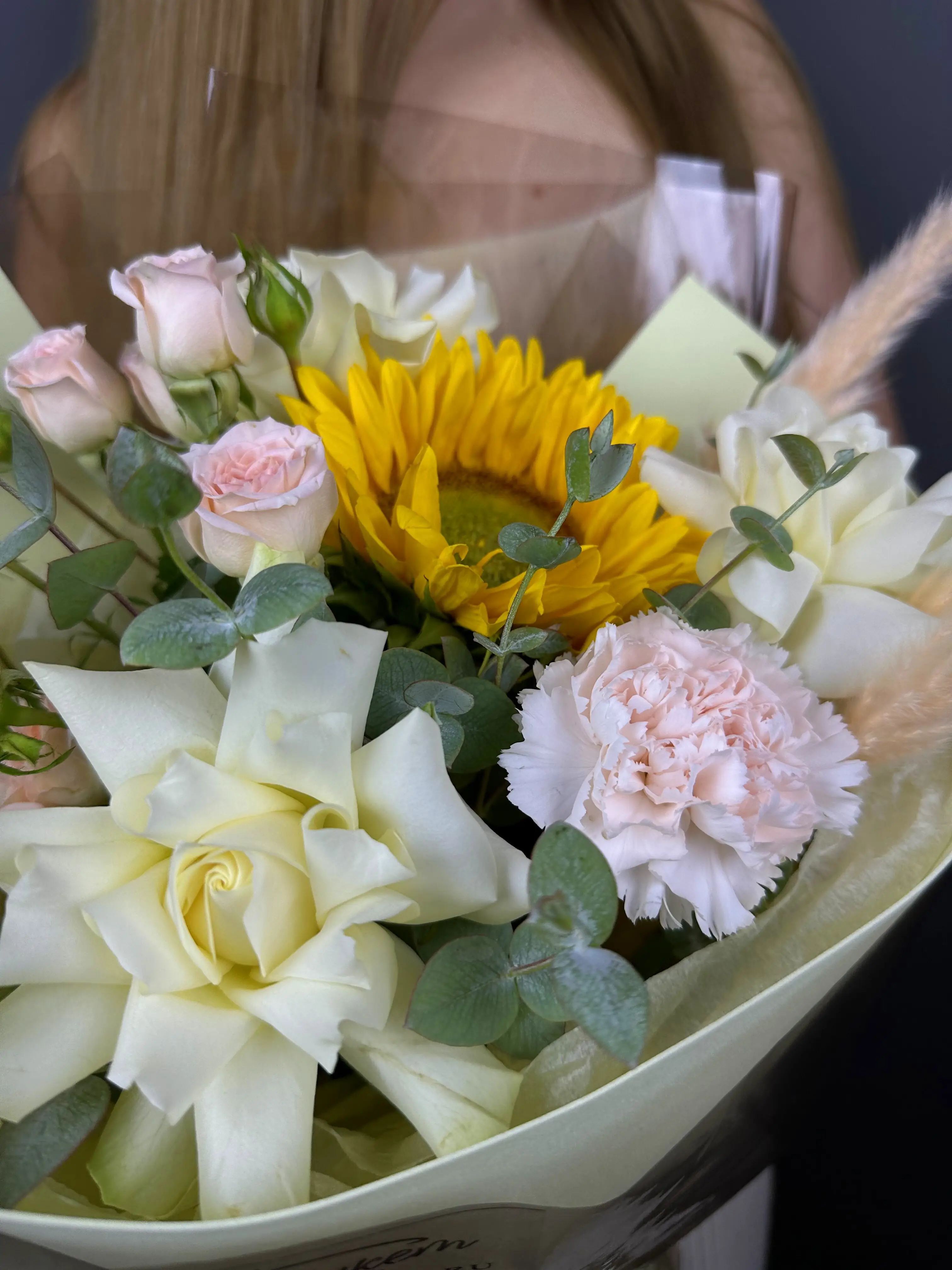 Букет с розами и подсолнухом - пример оформления на фото. Состоит из: Роза Кенийская - 3 шт,