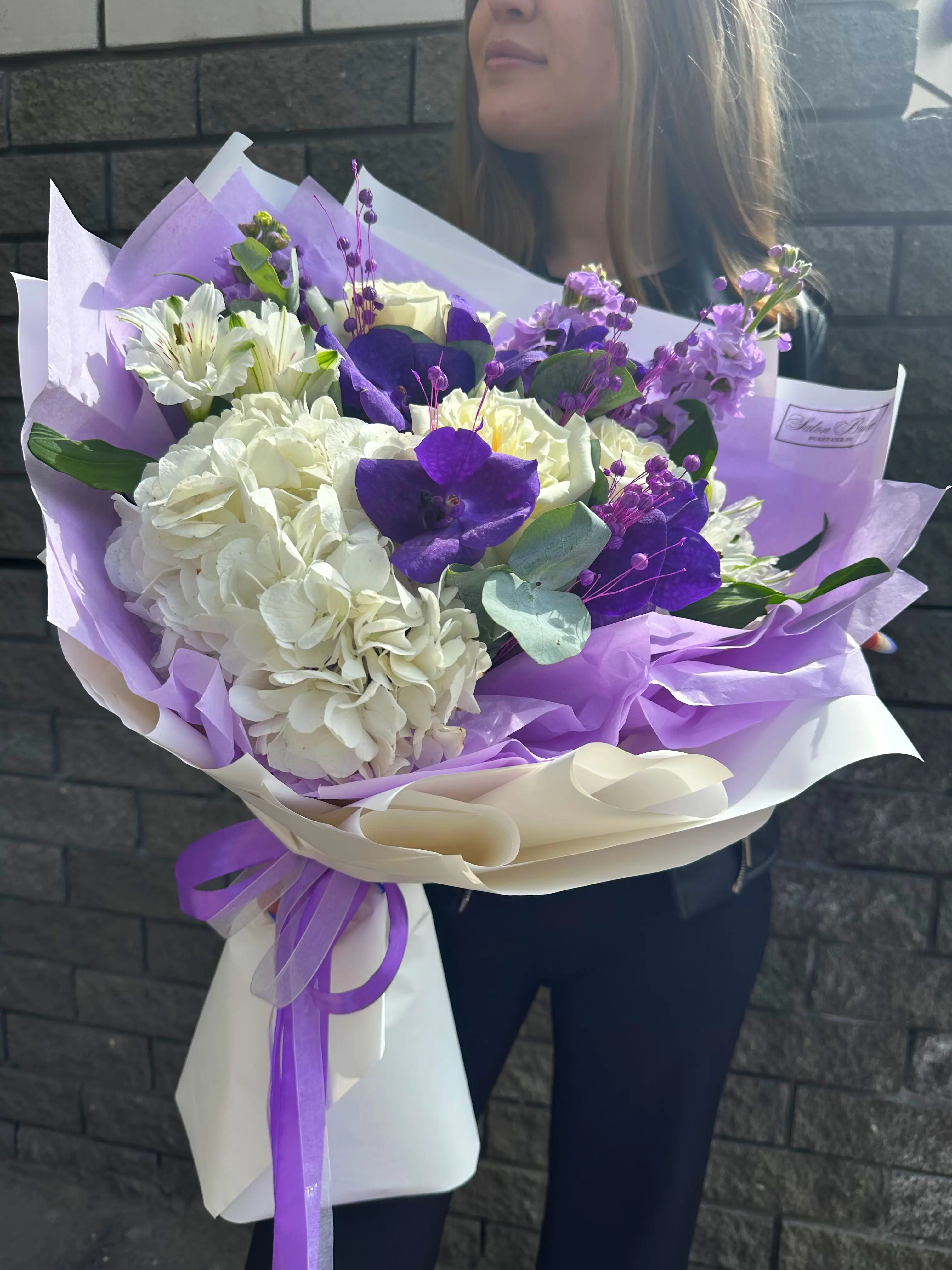 Букет с вандой и гортензией - пример оформления на фото. Состоит из: Ванда - 5 шт,