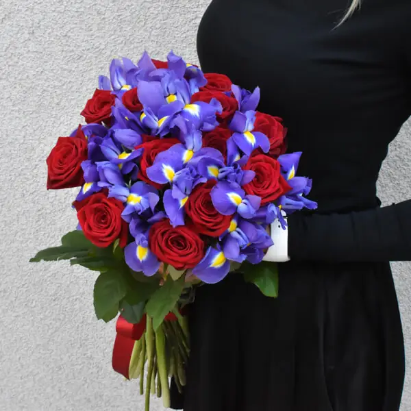 Букет "Свободный Полёт" - пример оформления на фото. Состоит из: Ирис Синий - 19 шт., Роза Красная (60 см.) - 13 шт., Лента. Собираем только из свежих цветов, после сборки пришлем Вам фото. Доставим по г. Дзержинску и Нижегородской области, стоимость - 6650 руб..