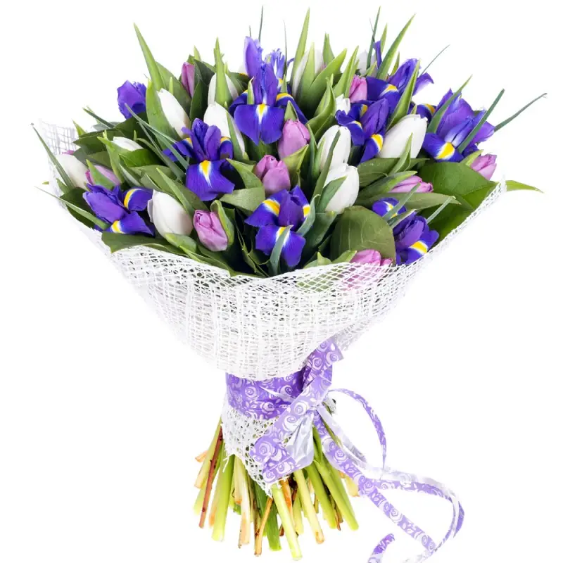 Букет "Велюр" - пример оформления на фото. Состоит из: Ирис Синий - 11 шт.,