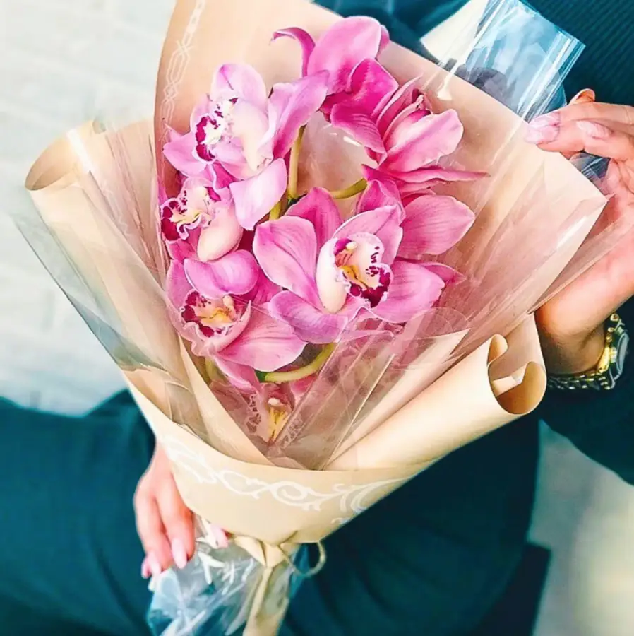 Букет "Ветка Розовой Орхидеи" - пример оформления на фото. Состоит из: Орхидея Цимбидиум Розовая (ветка) - 1 шт.,