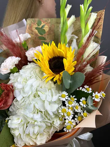 Букет с гортензией белой и подсолнухом