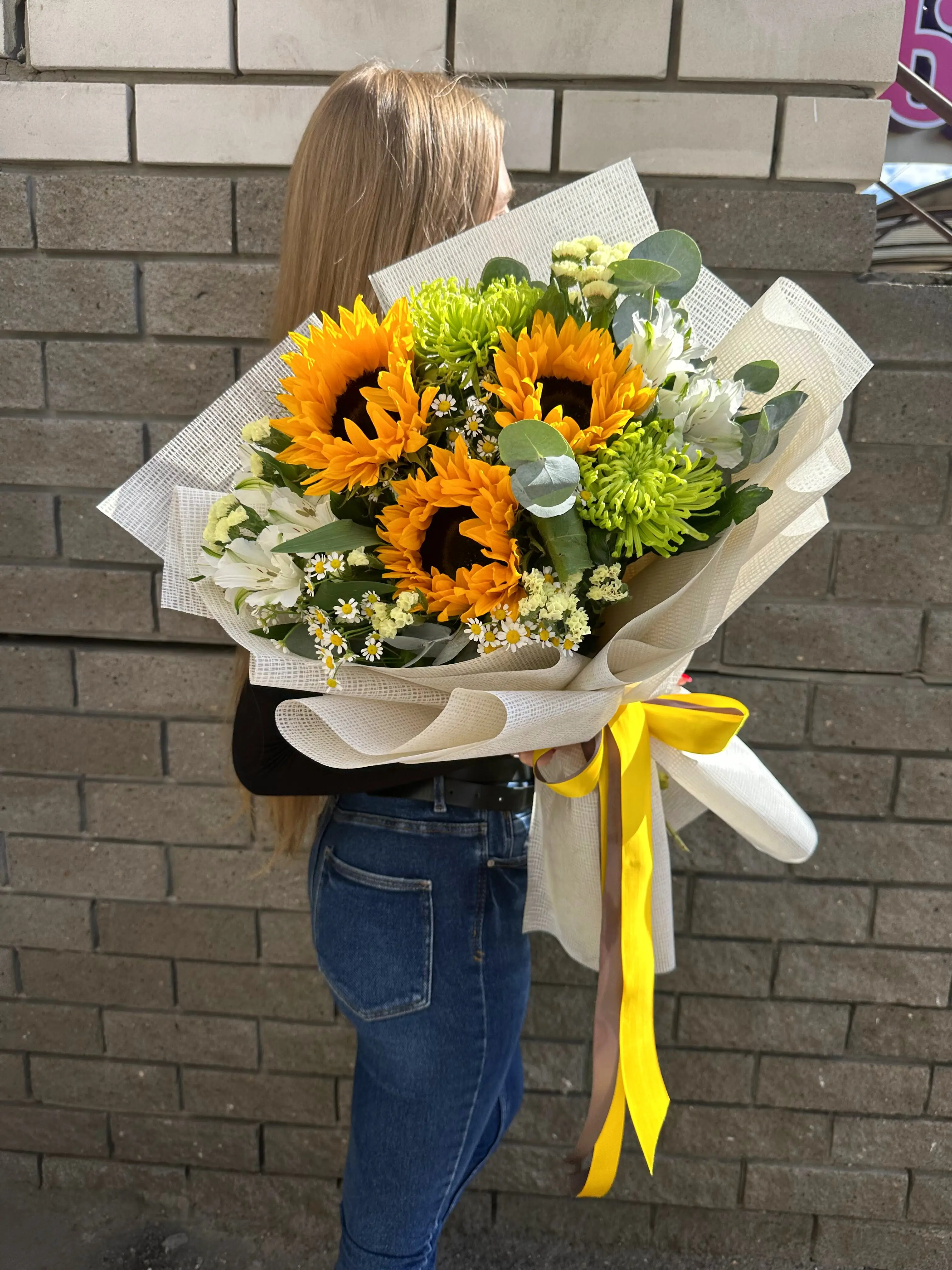 Летний букет с подсолнухами - пример оформления на фото. Состоит из: Подсолнух - 3 шт,
