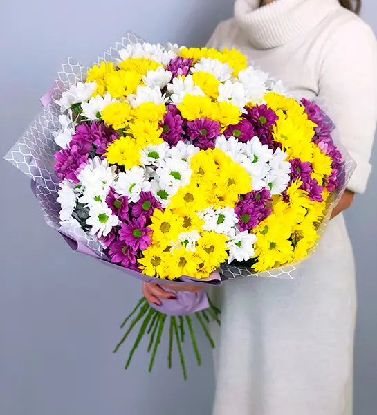 Букет из 25 хризантем микс в упаковке - пример оформления на фото. Состоит из: Хризантема кустовая - 25 шт.,