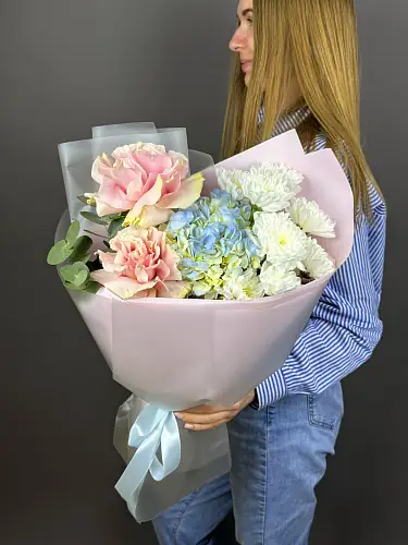 Нежный букет с розами и голубой гортензией - пример оформления на фото. Состоит из: Гортензия - 1 шт,