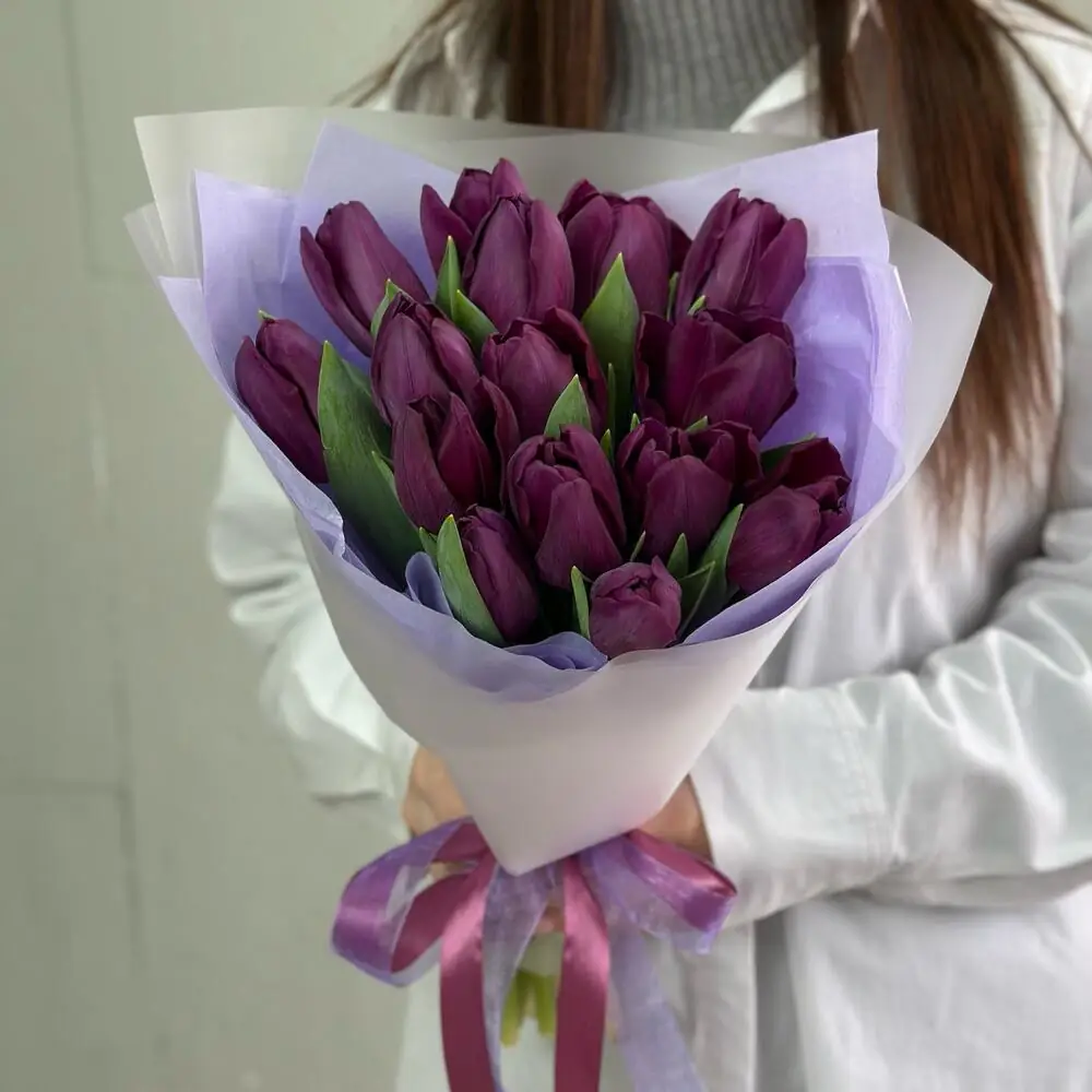 15 Сиреневых тюльпанов в нежной упаковке — купить по цене от 4250 руб. с доставкой в Дзержинске