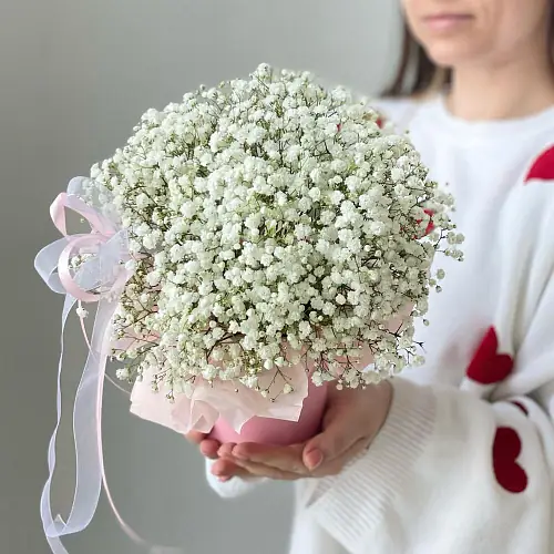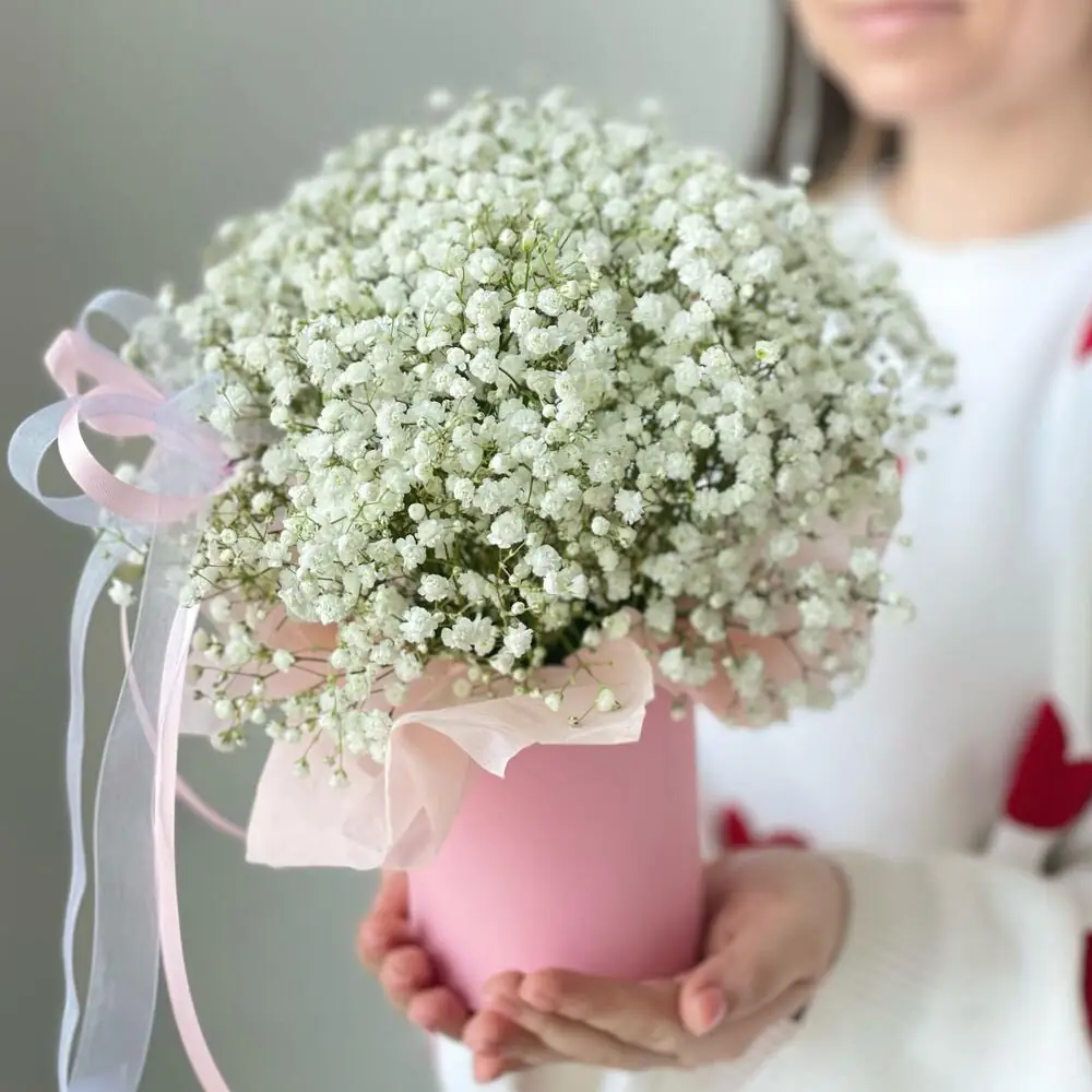 Белая гипсофила в шляпной коробке