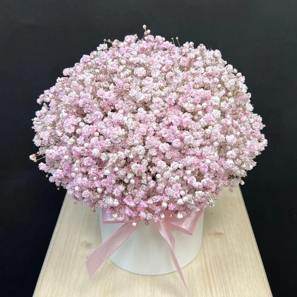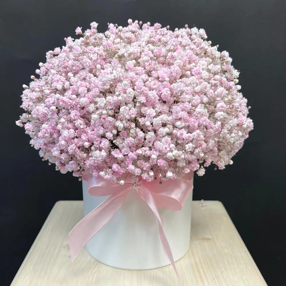 Нежная розовая гипсофила в шляпной коробке — купить по цене от 5590 руб. с доставкой в Дзержинске