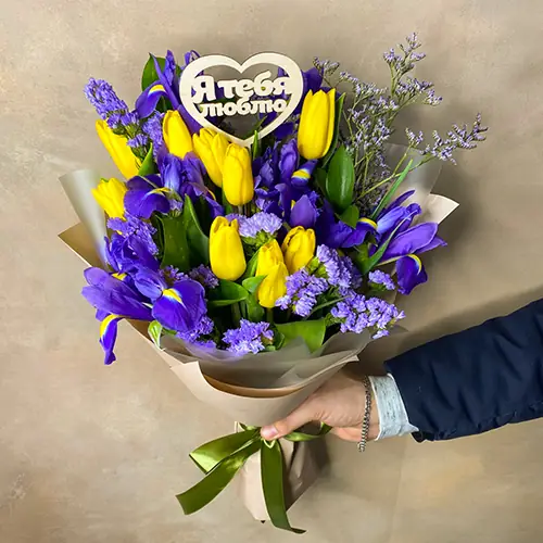 Букет из желтых тюльпанов и ирисов
