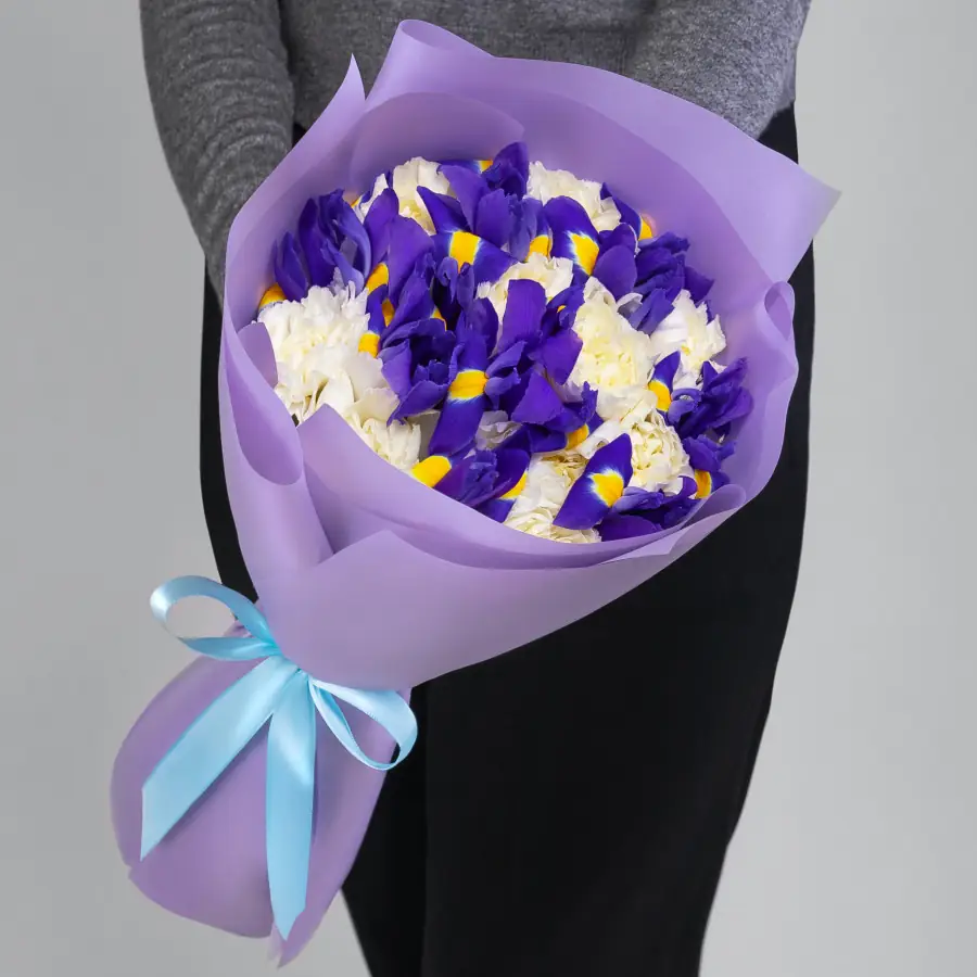 Букет с белыми гвоздиками и ирисами — купить по цене от 3570 руб. с доставкой в Дзержинске