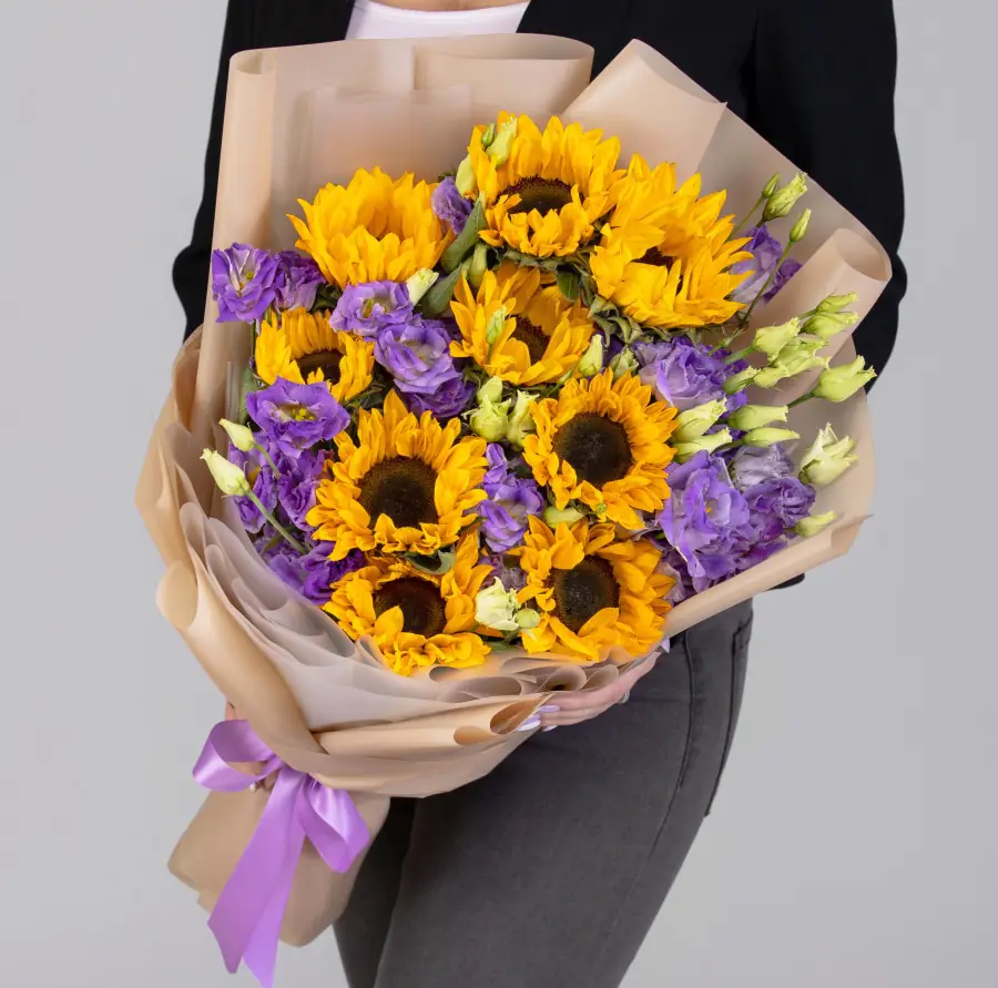 На фото - Подсолнухи и Фиолетовая Эустома. В составе данной композиции: Подсолнух - 9 шт,