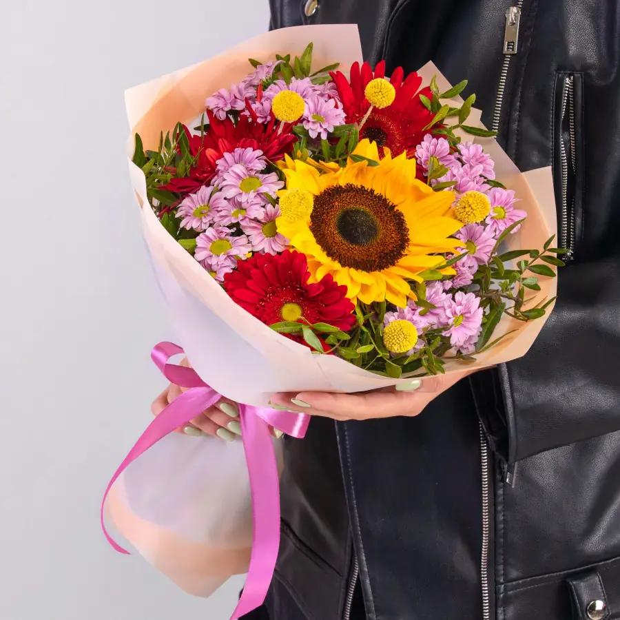 На фото - подсолнухи и кустовая хризантема. В составе данной композиции: Подсолнух - 1 шт,