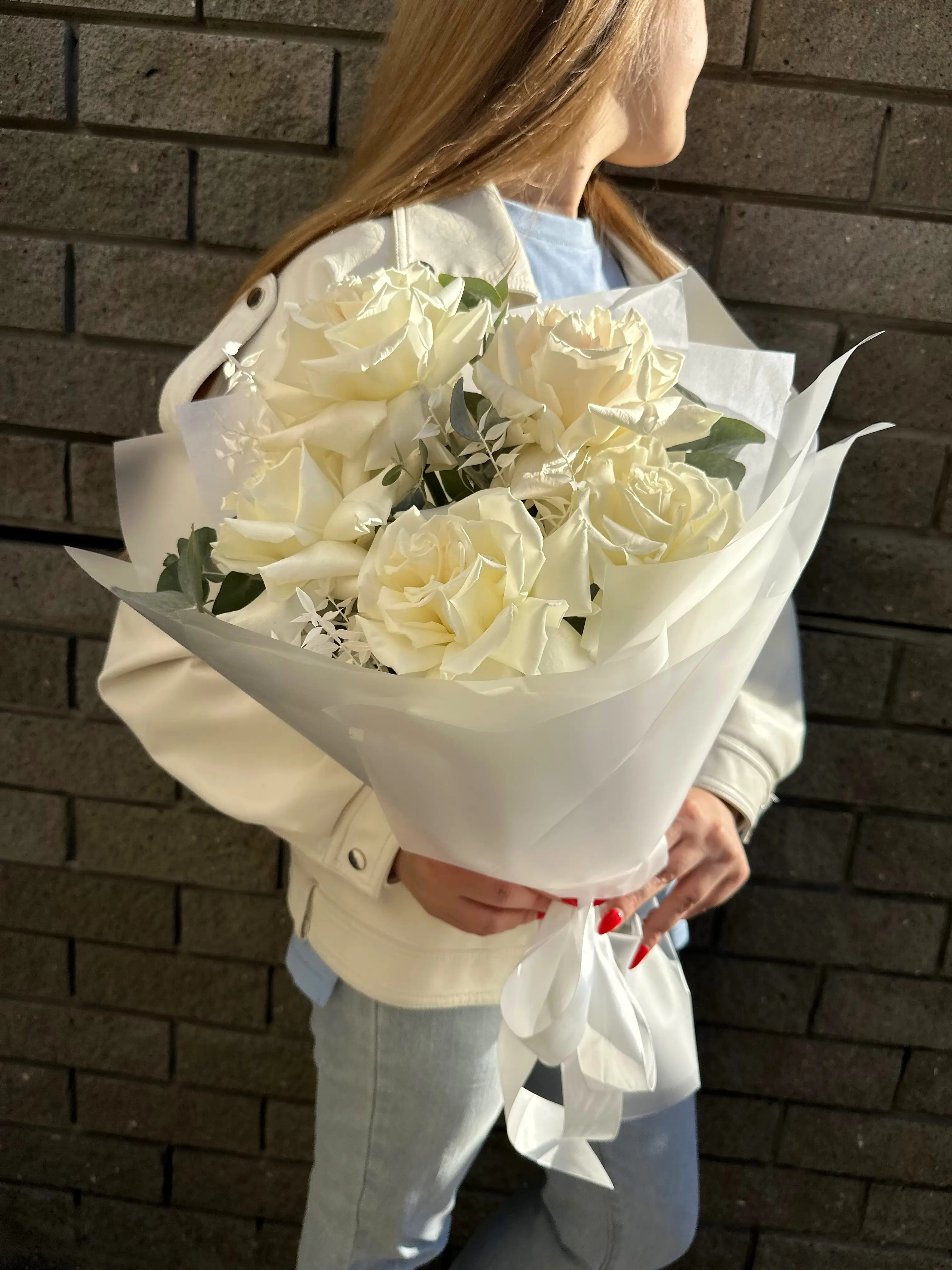 На фото - 5 Роз с эвкалиптом в упаковке . В составе данной композиции: Роза Пионовидная - 5 шт,