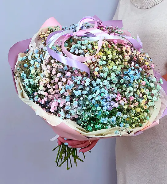 На фото - Стильный Букет из гипсофилы "Радуга". В составе данной композиции: Радужная гипсофила - 15 шт,