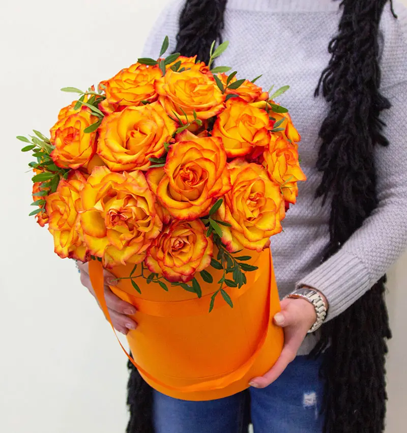 Шляпная коробка с огненно-рыжими розами премиум качества из Эквадора сорта Хай Мэджик. Пышная и объемная композиция, которая произведет впечатление на любую девушку! Для изготовления букетов в шляпных коробках мы используем ТОЛЬКО элитные сорта эквадорских роз.