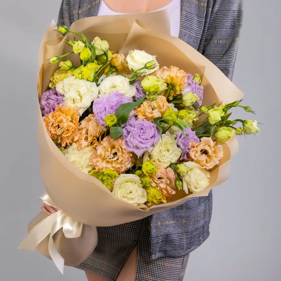 На фото - 25 Лизиантусов Микс в упаковке . В составе данной композиции: Эустома - 25 шт,