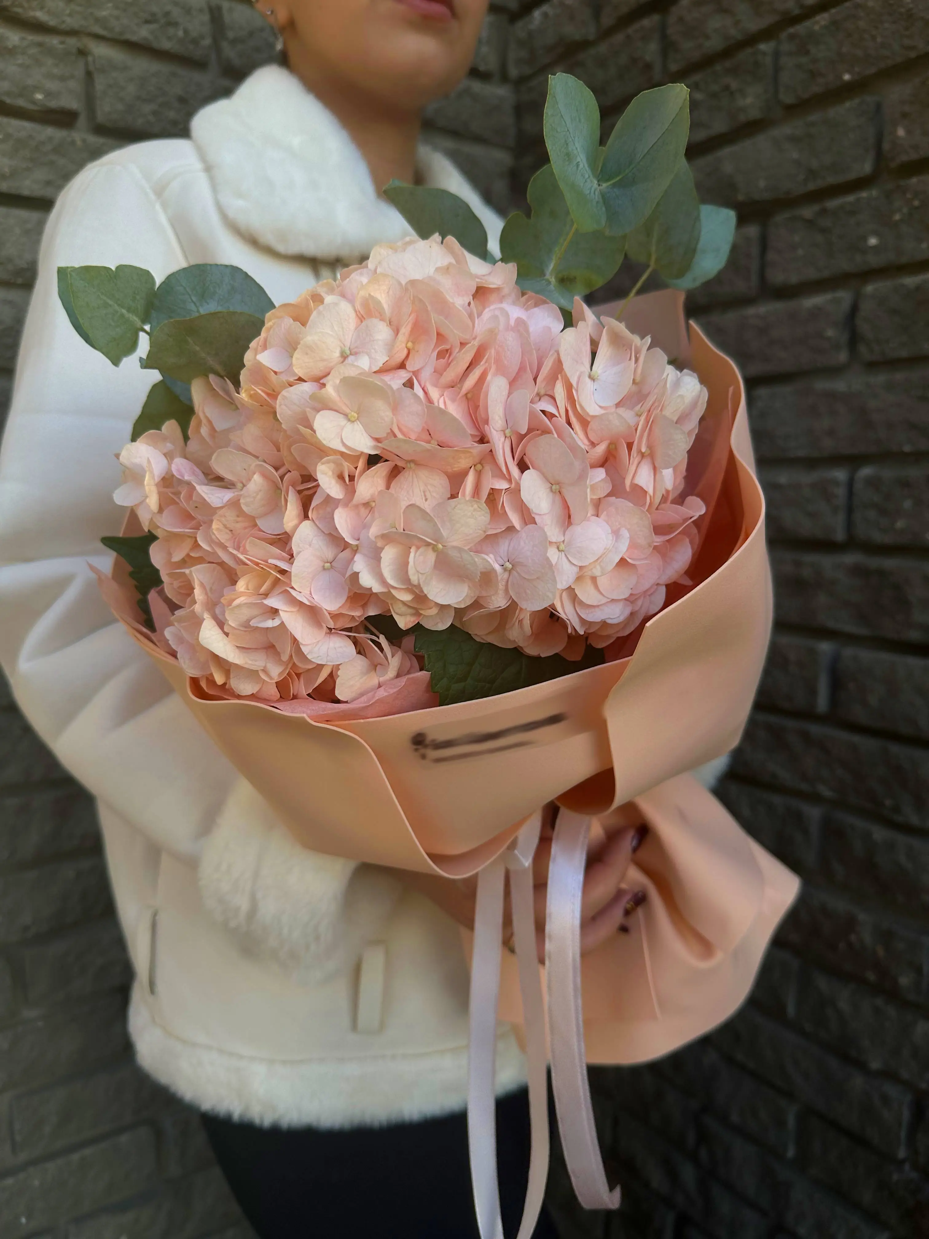 Розовая гортензия, символизирующая сердечную привязанность, благодарность и искренние эмоции, дарит букету пышность и нежный шарм. Её роскошные соцветия идеально дополняются изящными веточками эвкалипта — символа защиты, благополучия и свежести. Этот союз создает неповторимую гармонию нежных розовых оттенков и приглушенной зелени, даря ощущение спокойствия, уюта и заботы.