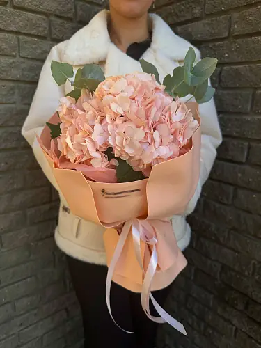 Подарите нежность и умиротворение в самом изысканном воплощении. Этот очаровательный букет, в котором пышные соцветия розовой гортензии гармонично сочетаются с ажурными веточками эвкалипта, создает ощущение мягкой романтики и безмятежной гармонии. Композиция, наполненная нежностью и естественной грацией, станет воплощением самых тёплых и искренних чувств.