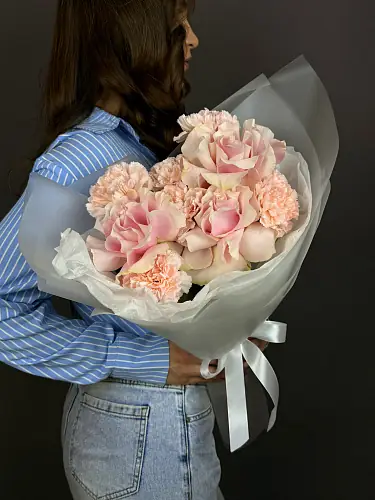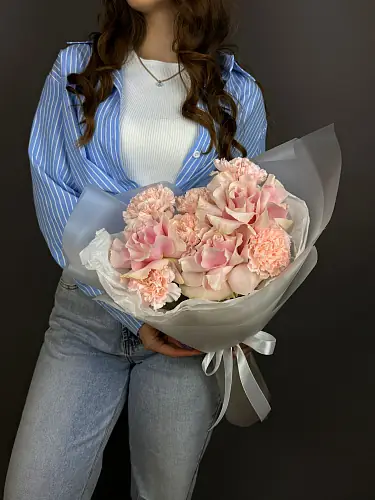 Диантусы — это цветы, которые отличаются особой изысканностью и изяществом форм. Их нежные розовые оттенки придают букету легкость и романтичность. Роз — символ любви и страсти, они добавляют букету пышности и глубины.