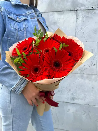 Красные герберы — символ страсти, энергии и силы духа, идеально подходящие для выражения эмоций и теплых пожеланий адресату. Каждая розетка цветка — воплощение нежности и уверенности в себе, гармоничное сочетание которых создает изысканный букет.