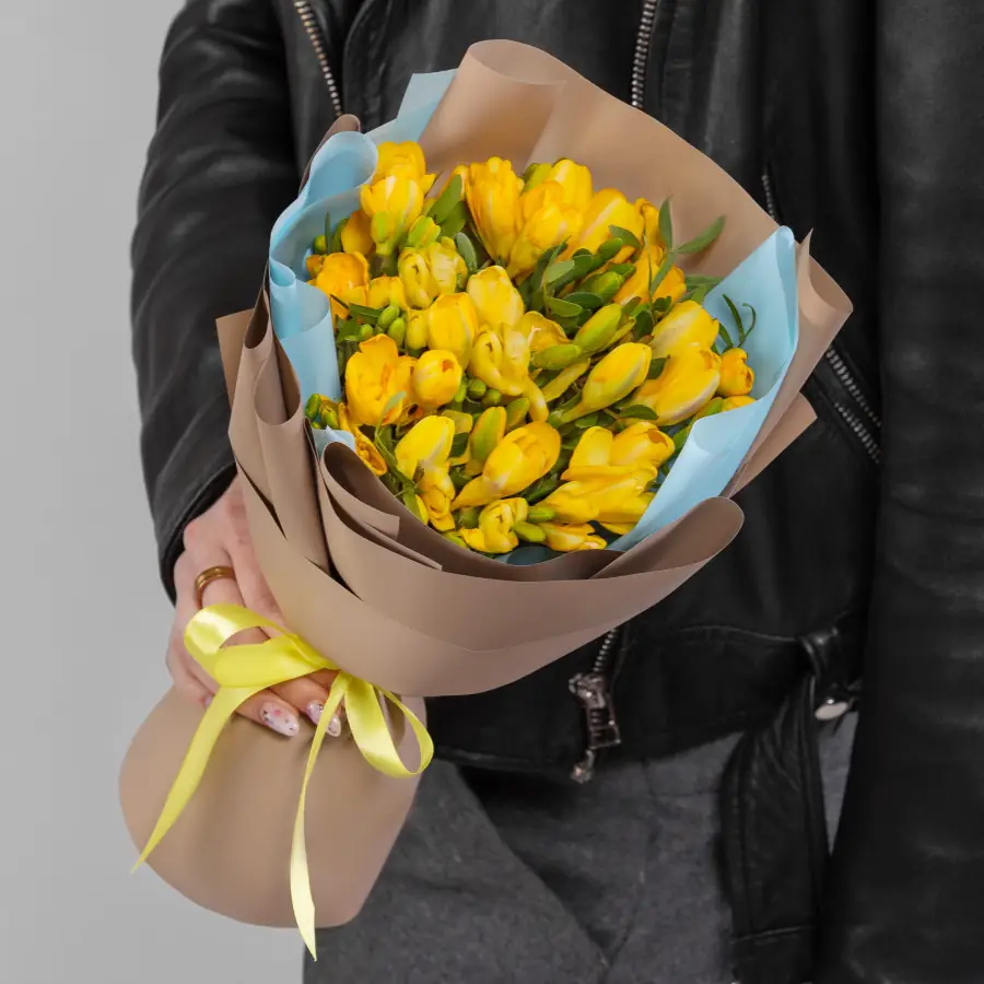 На фото - 15 Желтых Фрезий в упаковке. В составе данной композиции: Фрезия - 15 шт,