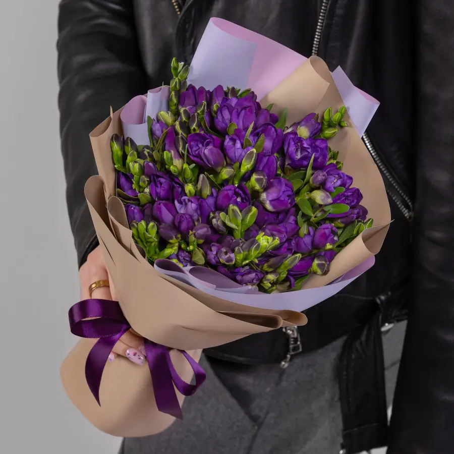 На фото - 25 Фиолетовых Фрезий в упаковке. В составе данной композиции: Фрезия - 25 шт,