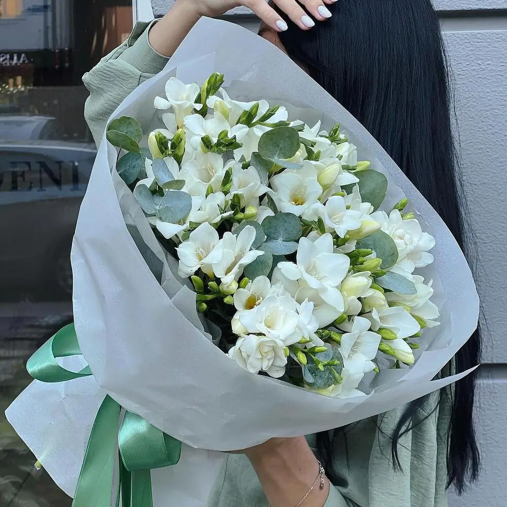 На фото - Фрезия в дизайнерской упаковке . В составе данной композиции: Фрезия - 39 шт,