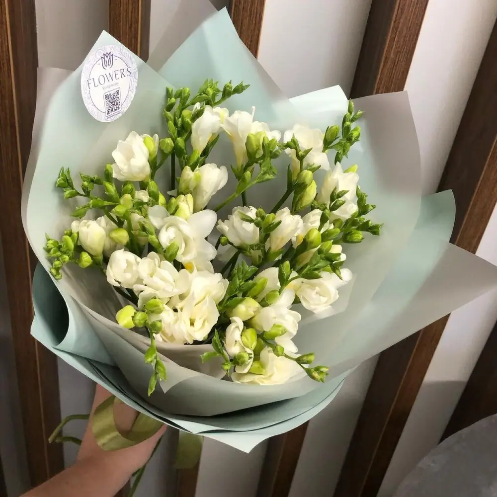 На фото - Фрезии в нежной упаковке . В составе данной композиции: Фрезия - 25 шт,