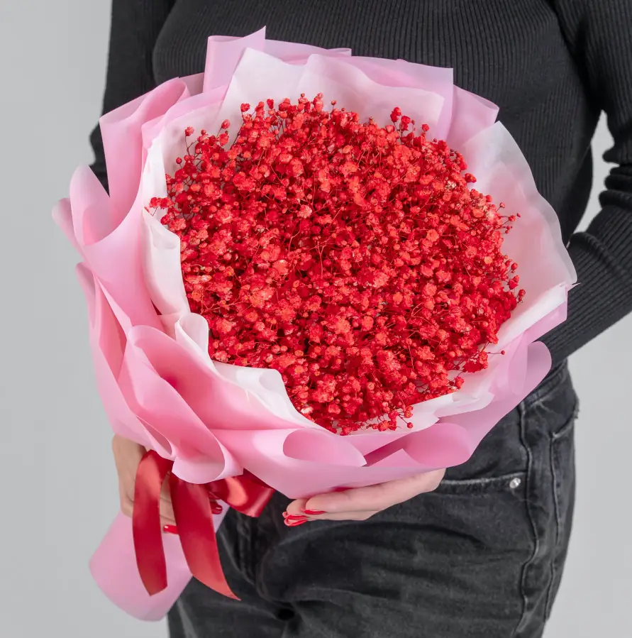 На фото - 9 Красных Гипсофил. В составе данной композиции: Гипсофила - 9 шт, Дизайнерская упаковка, Лента атласная, . На сайте buket-dzr.ru Вы найдете большой выбор недорогих букетов, цветочных композиций для любого повода. У нас можно заказать 9 Красных Гипсофил за 3990 руб.
