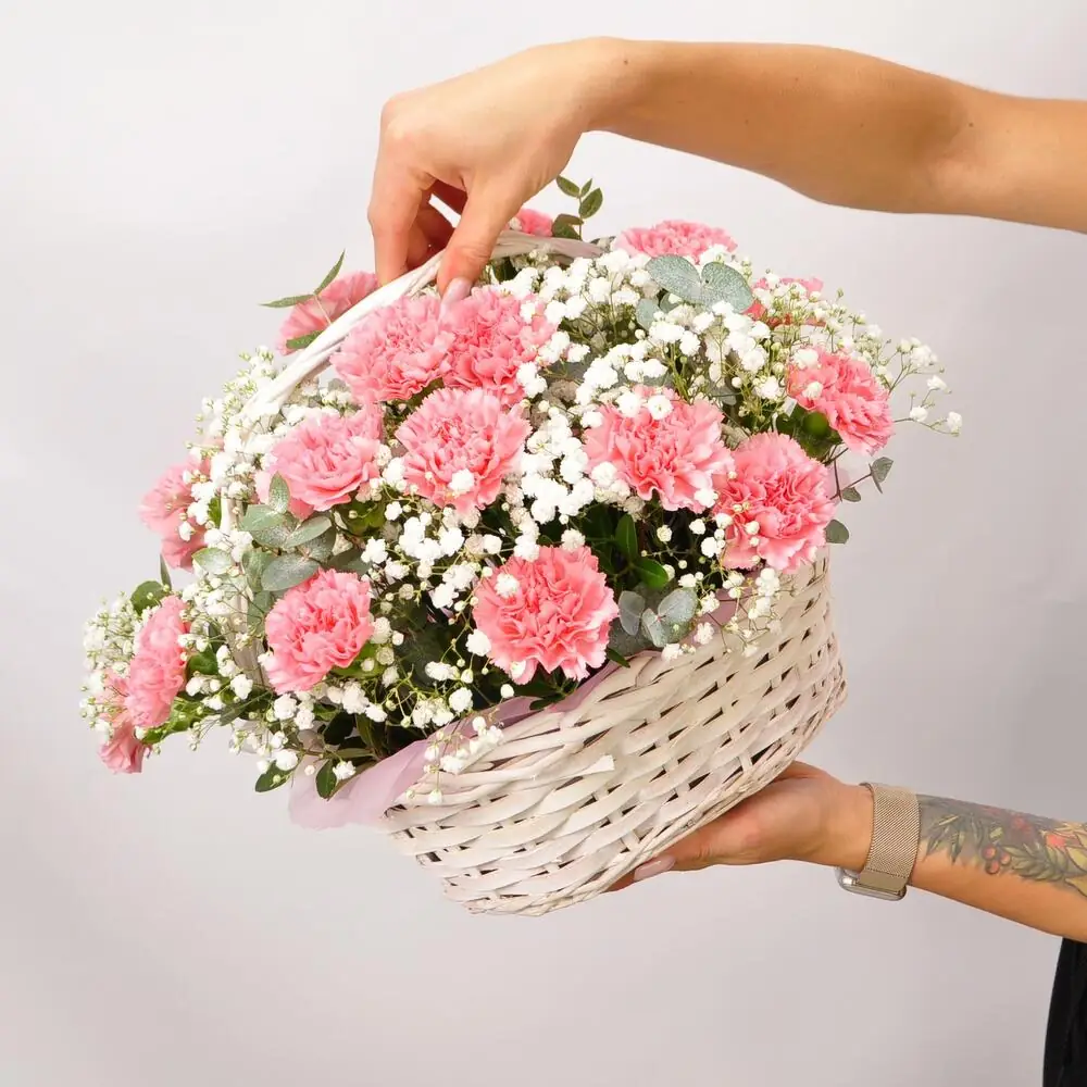 На фото - Композиция гвоздики и гипсофила в корзине. В составе данной композиции: Гвоздика цветная - 23 шт,