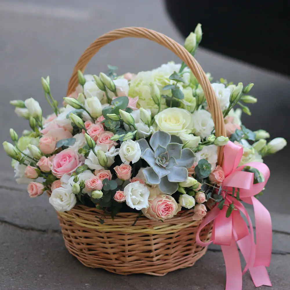 На фото - Корзина цветов белых и розовых . В составе данной композиции: Роза белая - 13 шт.,
