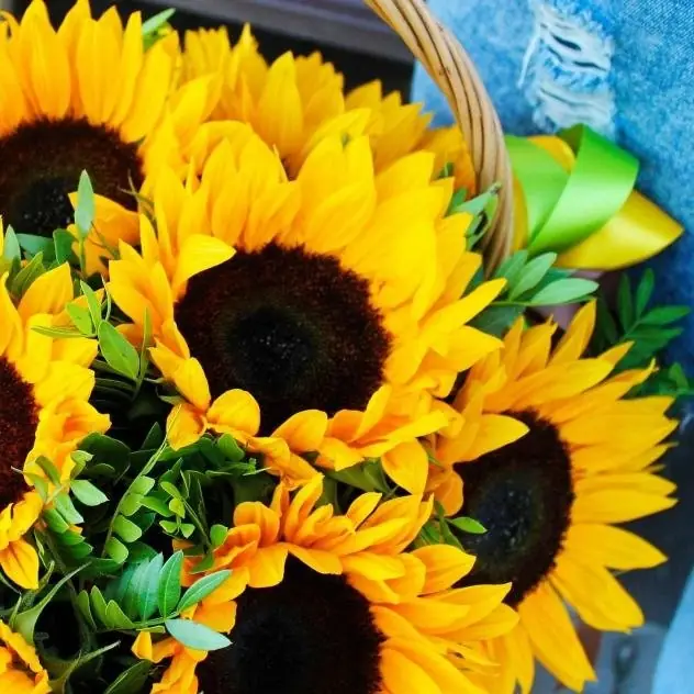 Подсолнухи с зеленью в корзине - роскошный презент, символизирующий лето и солнце.