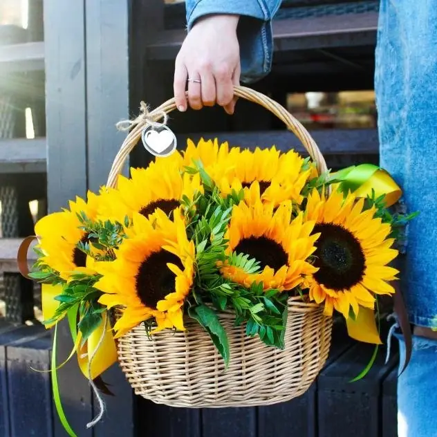 На фото - Корзина с подсолнухами . В составе данной композиции: Подсолнух - 11 шт.,