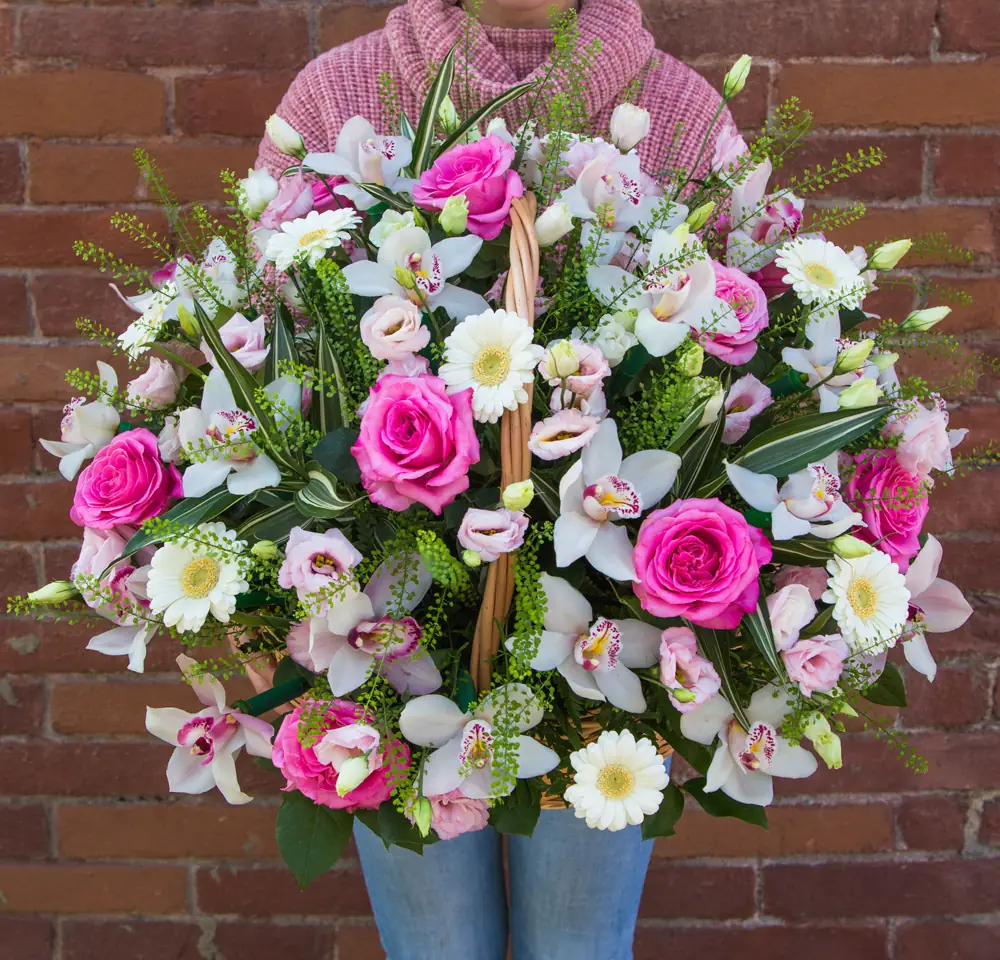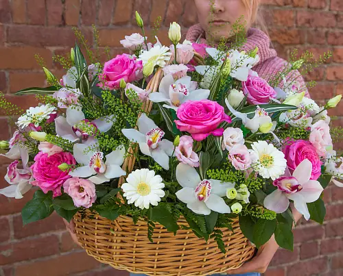 Роскошная композиция с цветами в корзине.