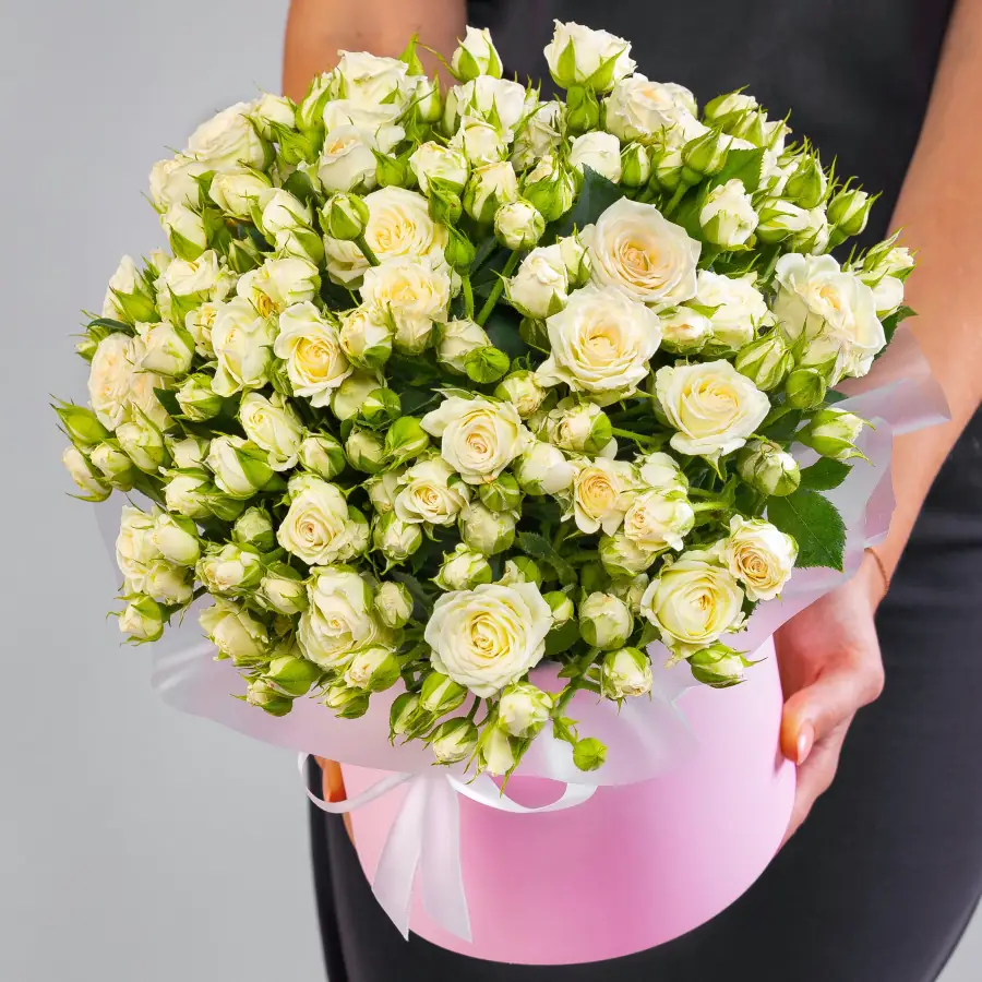 У нас можно заказать 19 Кустовых Белых Роз в коробке за 7275 руб.