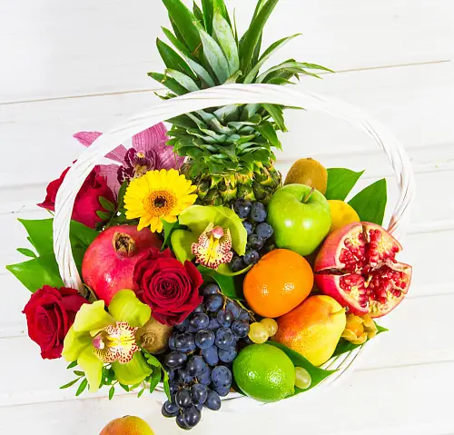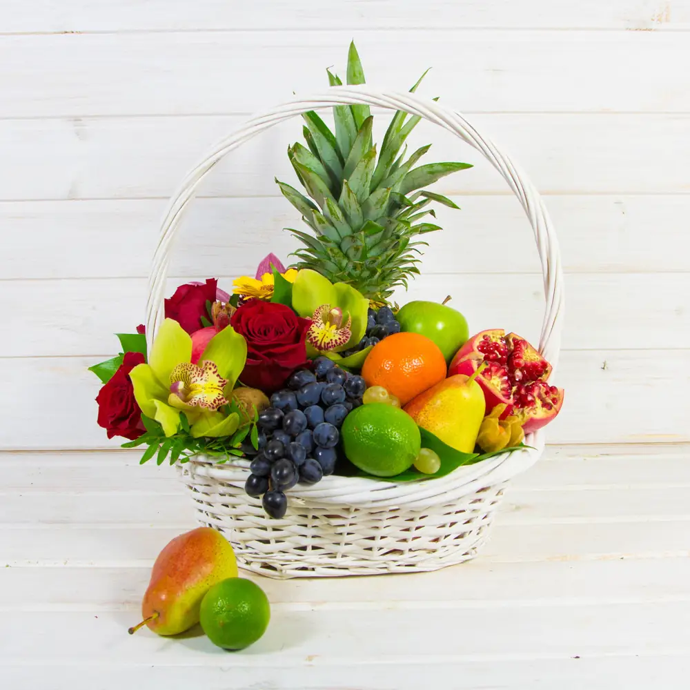 Сочные фрукты красиво уложены в плетеную корзину и дополнены красными эквадорскими розами, орхидеей и герберами.