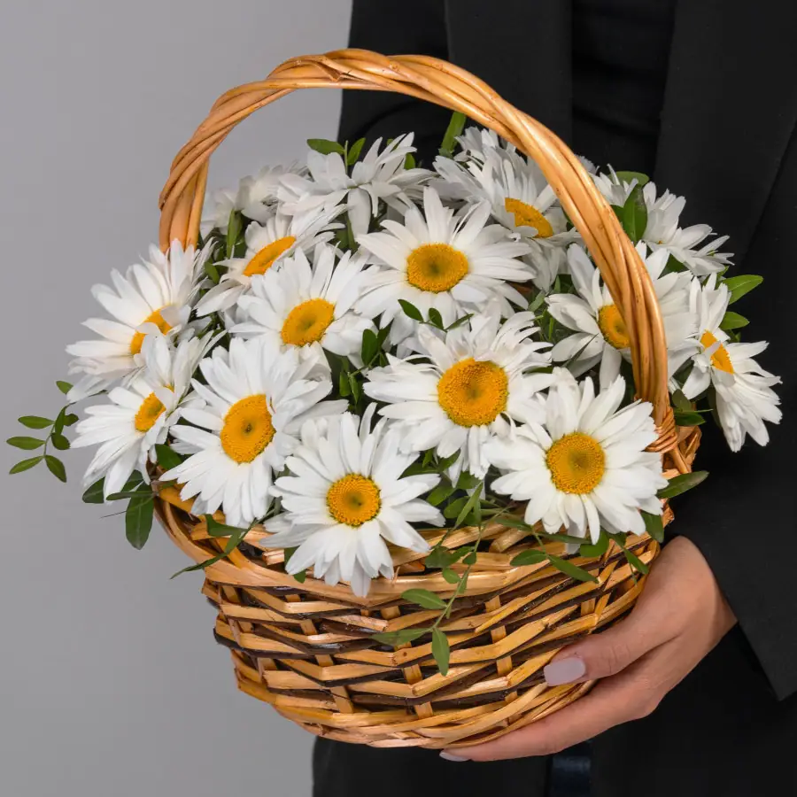 На фото - 15 Крупных Ромашек в корзине. В составе данной композиции: Ромашка - 15 шт,
