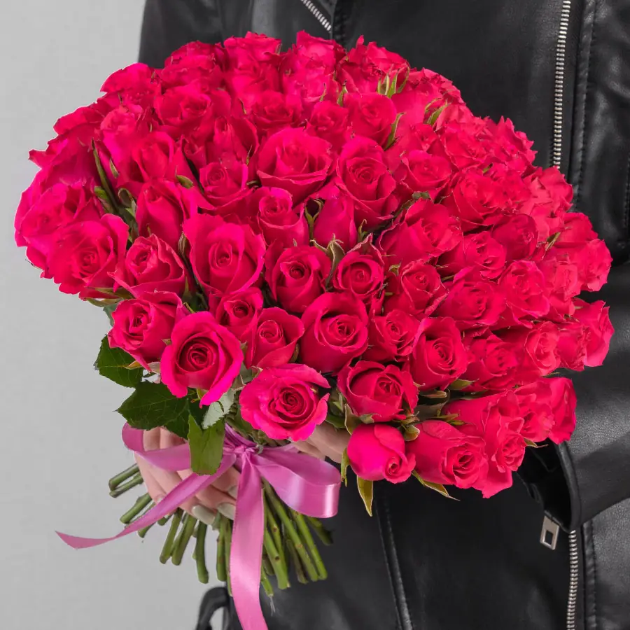 Букет 75 малиновых роз – это отличный подарок, который идеально подходит для вручения женщине в любой сезон. Сочный, яркий, красивый оттенок порадует получательницу, принесет ей только положительные эмоции и впечатления.