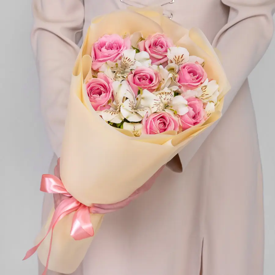 В нашем интернет-магазине можно приобрести яркие букеты с альстромериями и розами.