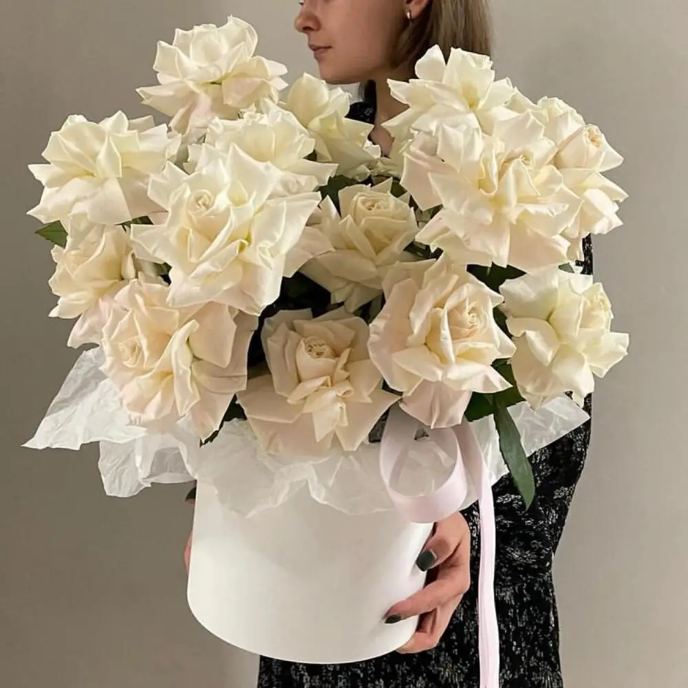 Французские белые розы в шляпной коробке — купить с доставкой в Дзержинске