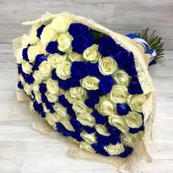 На фото - 101 роза Нежный микс в упаковке . В составе данной композиции: Роза Эквадор - 101 шт,
