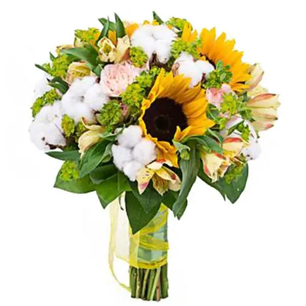 Букет невесты с подсолнухами и хлопком — отличный выбор для дополнения очаровательного образа! На сайте "Салон цветов Букет" Вы найдете свадебные букеты выполненные в разных техниках и стилях. Цена данного букета —4160 руб., а в его состав входят:Альстромерия — 5 шт. ,