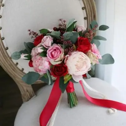 Букет невесты с розами — отличный выбор для дополнения очаровательного образа! На сайте "Салон цветов Букет" Вы найдете свадебные букеты выполненные в разных техниках и стилях. Цена данного букета —9015 руб., а в его состав входят:Пион Сара Бернар - 5 шт.,