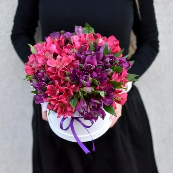 На фото - Шляпная коробка Разноцветных Альстромерий . В составе данной композиции: Альстромерия - 15 шт,