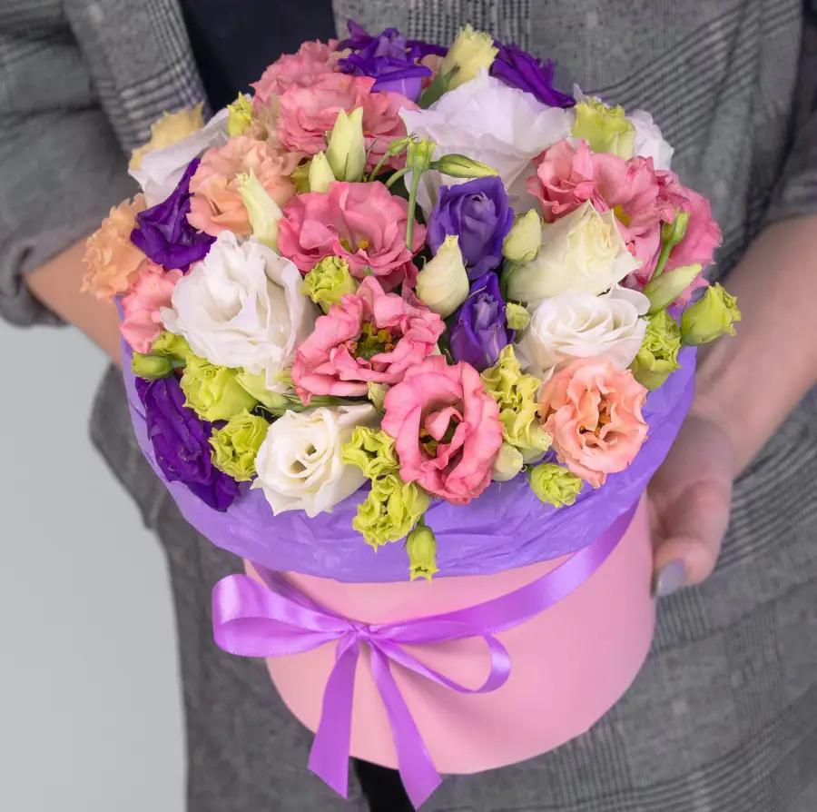 На фото - 7 Эустом Микс в коробке . В составе данной композиции: Эустома - 7 шт ,