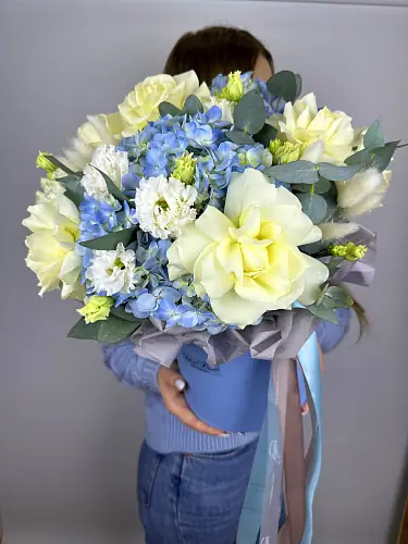 У нас можно заказать Голубая композиция с гортензией и розами за 6199 руб. с доставкой Дзержинске и по области