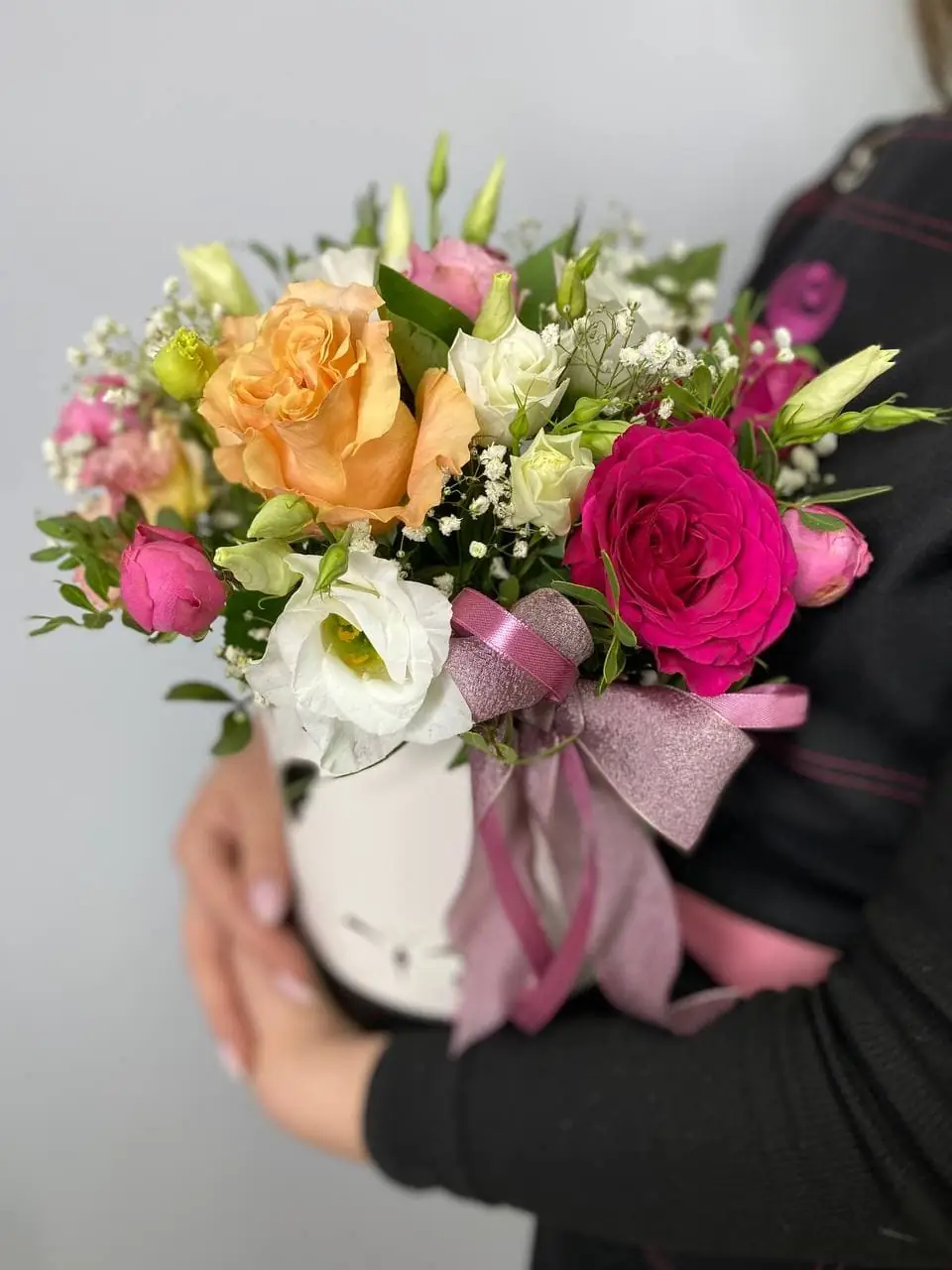 У нас можно заказать Шляпная коробка с цветами “Без повода” из роз и гипсофил за 3348 руб. с доставкой Дзержинске и по области